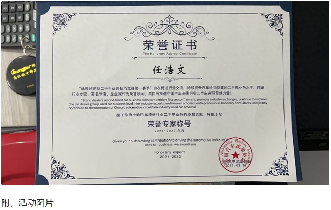 精估棒快讯丨中国汽车流通协会活动中担任评委祝贺 成都精估棒新能源汽车有限公司总经理 成都二手车经销商商会会长 任浩文 在中国汽车流通协会“品牌经销商二手车业务技巧竞赛第一赛季”活动中担任评委工作,本比赛旨在促进行业交流,持续提升汽车经销商集团二手车业务水平。鉴于任浩文先生为推动汽车流通行业二手车业务的卓越贡献,特被特授予“荣誉专家”称号。