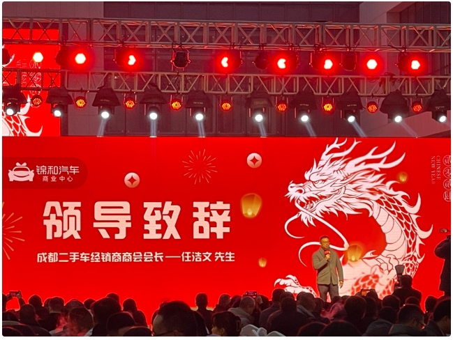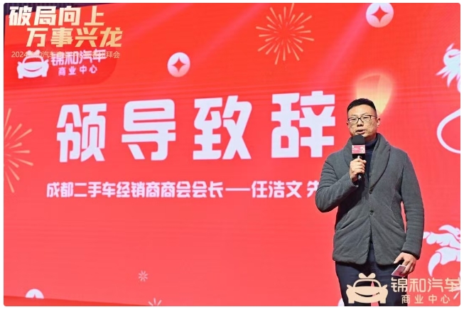 成都精估棒新能源汽车有限公司总经理 成都二手车经销商商会会长 任浩文 在成都锦和汽车商业中心2023年年度庆典上致辞。